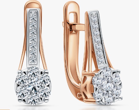 These elegant drop earrings are a perfect blend of classic style and modern flair. Crafted in a beautiful two-tone design, they feature a polished rose gold frame that provides a warm, flattering glow. The main body of the earring is a graceful open loop, leading down to a magnificent cluster of brilliant-cut diamonds. The cluster is designed to resemble a single, larger stone, maximizing sparkle and fire. The top section of the earring is accented with a line of pavé-set diamonds in a contrasting white gold setting, creating a striking visual contrast. These earrings are secured with a hinged lever-back clasp, ensuring they are both comfortable and safe to wear.
