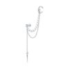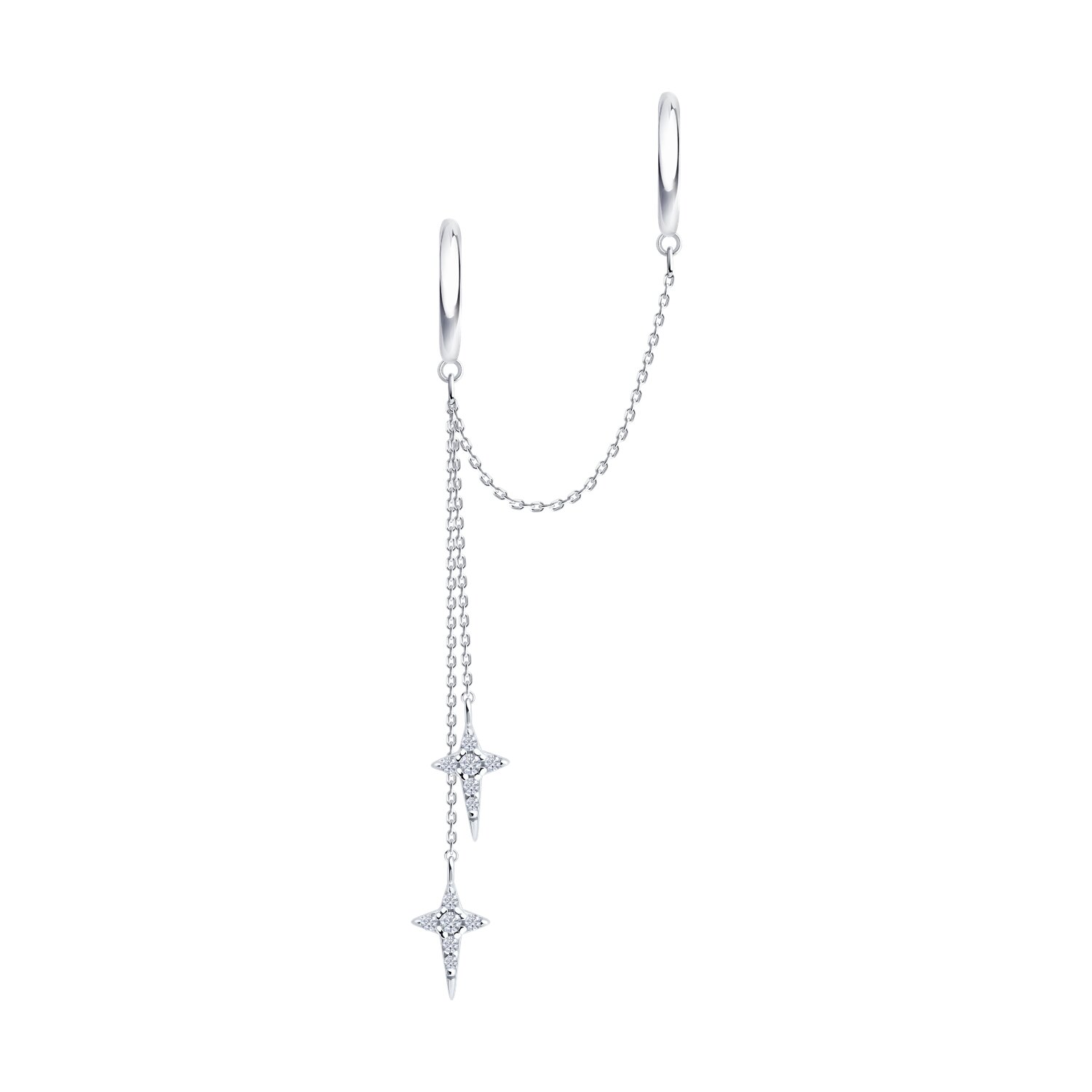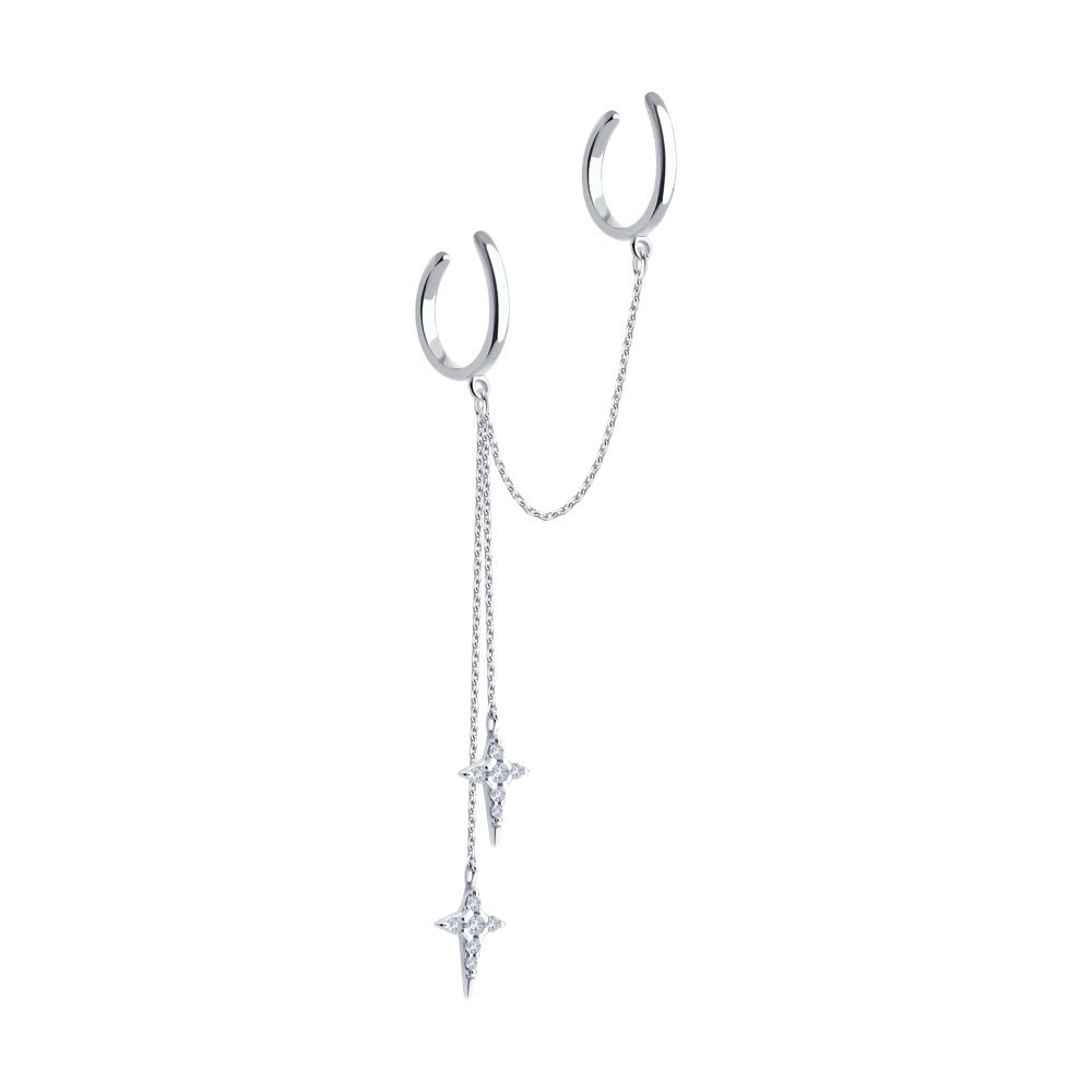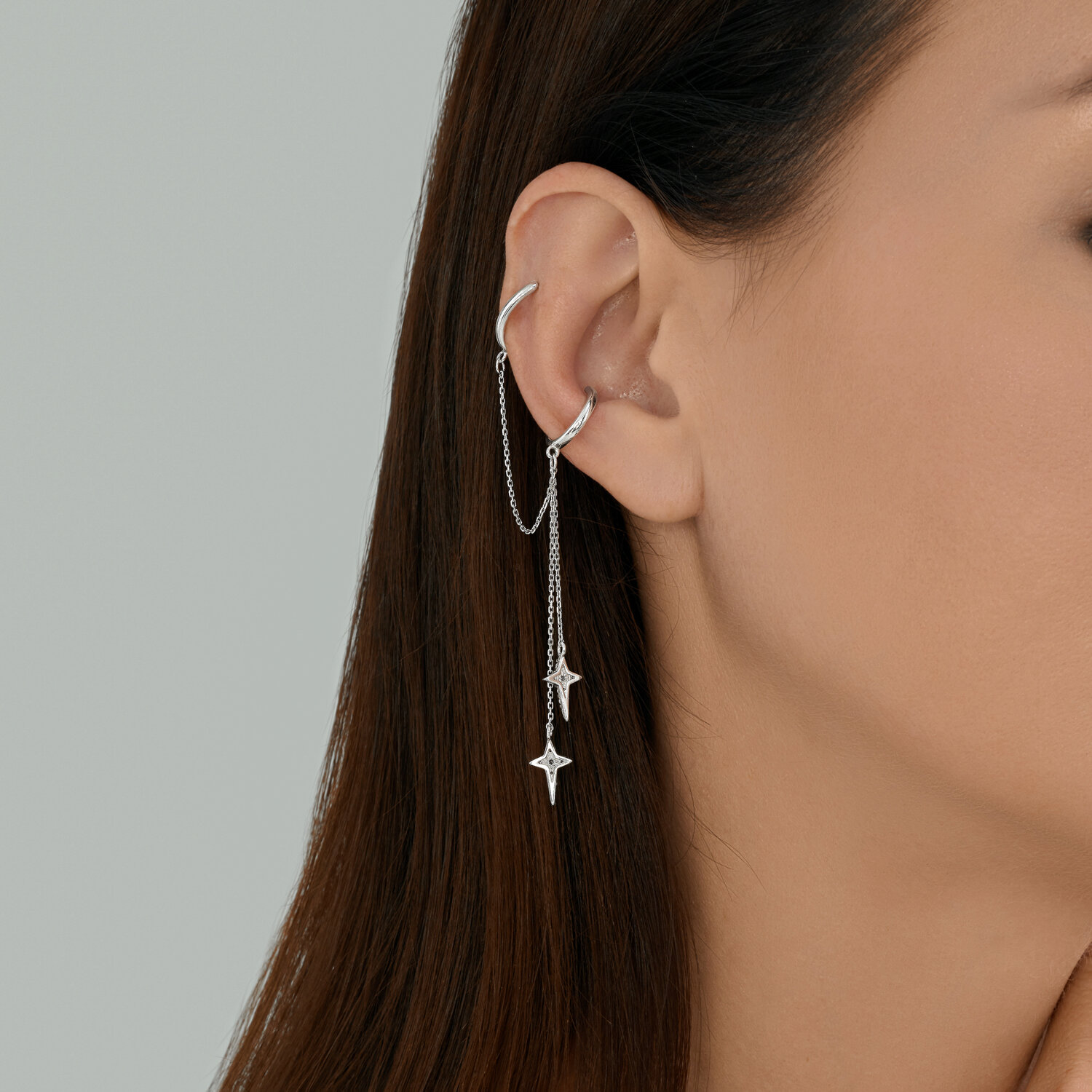 Delicate and modern, this silver earring features a dual-hoop design connected by fine chains and adorned with sparkling cubic zirconia star charms. The asymmetrical drop creates a graceful, celestial-inspired look that adds a touch of cosmic elegance to any outfit. Perfect for those who love bold yet refined accessories.