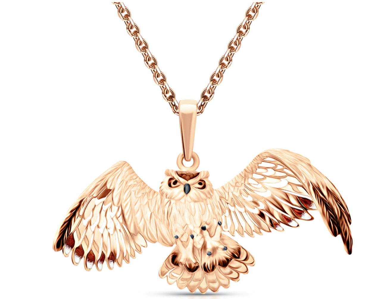 This exquisite rose gold owl pendant necklace is a captivating blend of elegance and artistry. The pendant showcases a meticulously crafted owl with outstretched wings, its form brought to life through intricate detailing on the feathers, eyes, and talons. Suspended from a delicate chain composed of small, linked segments, the pendant adds a touch of charm and sophistication to any ensemble. Perfect for those who appreciate unique and symbolic jewellery, this necklace is a beautiful statement piece.