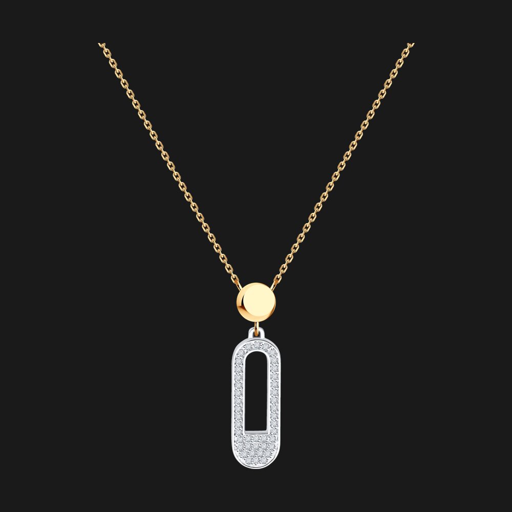 A modern masterpiece of elegance, this necklace is crafted from the perfect fusion of yellow gold and white gold. Its sleek pendant features a geometric open design, gracefully outlined with brilliant diamonds that add a touch of radiant sparkle. Suspended from a fine gold chain, the piece combines contemporary minimalism with timeless luxury. Versatile and refined, this necklace is ideal for both everyday sophistication and special occasions.