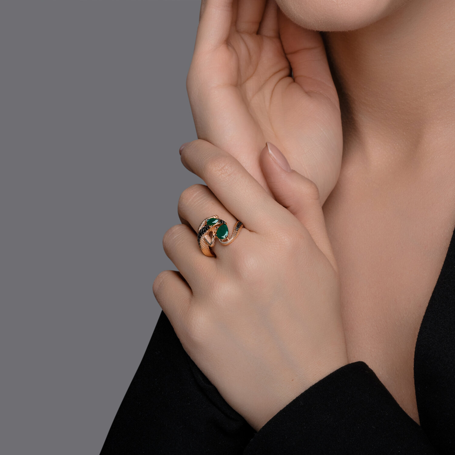 Command attention with this stunning serpent ring. A gilded silver snake coils around your finger, its eyes set with mesmerizing green agates and its body sprinkled with midnight-black cubic zirconia. This is not just a ring—it’s a statement.
