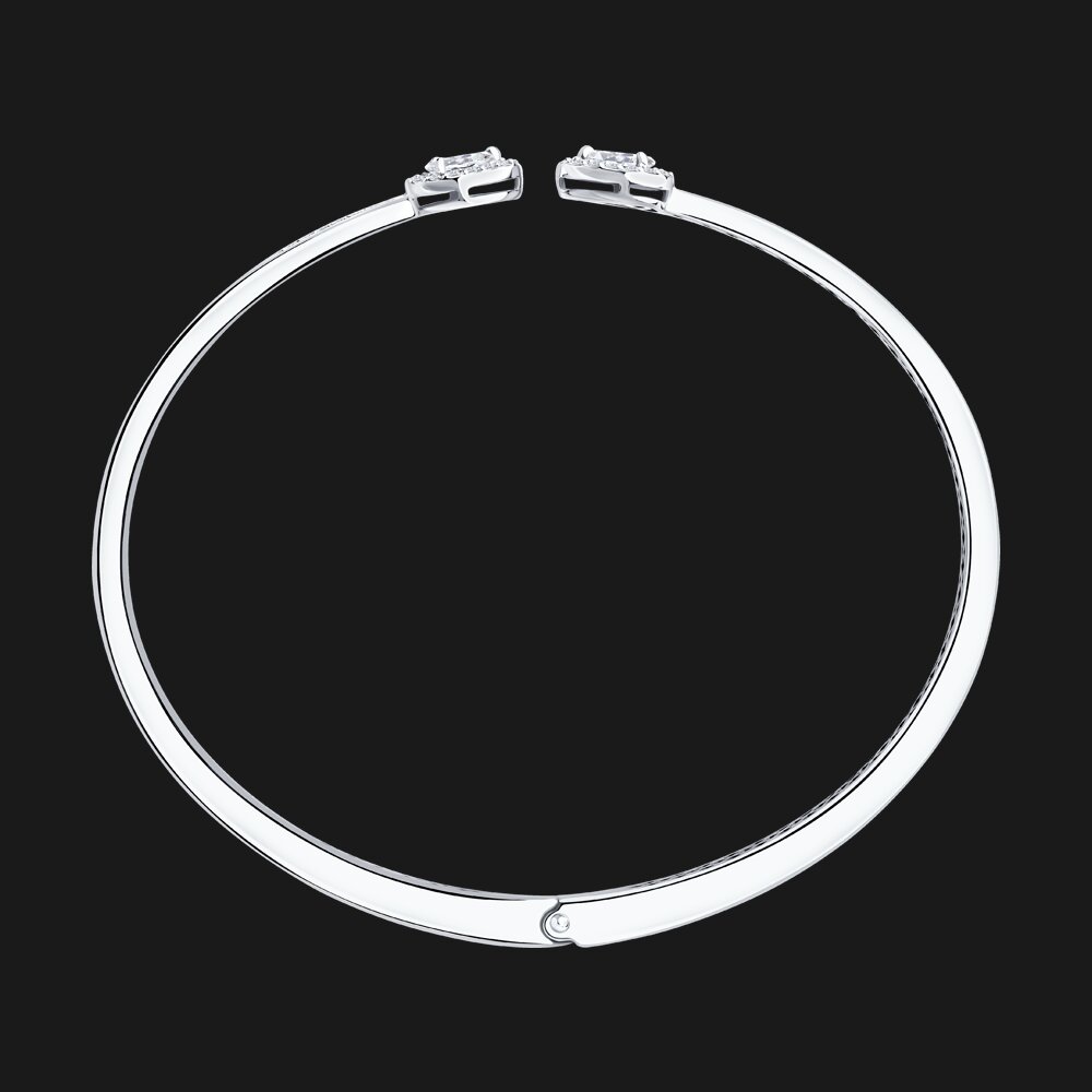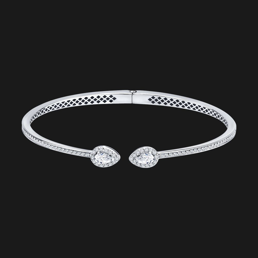 Crafted in luminous white gold, this open bangle bracelet redefines elegance with its contemporary yet timeless design. At each end, two pear-shaped lab-grown diamonds radiate brilliance, framed by a delicate halo of smaller stones that continue along the band. The open cuff silhouette offers both modern sophistication and everyday versatility, making it an exquisite statement of sustainable luxury. Perfect for layering or wearing solo, this bracelet adds a graceful touch of sparkle to any occasion.