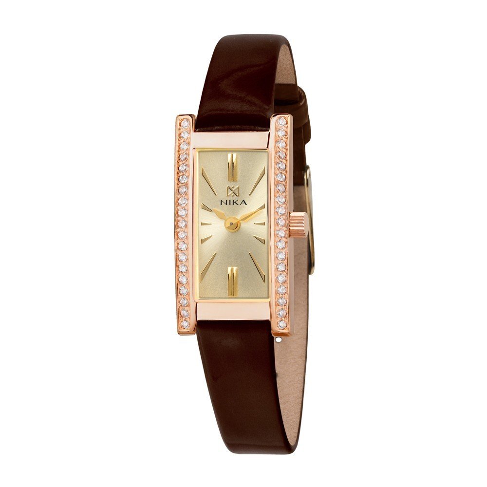 NIKA Ladies’ Crystal-Set Leather Watch – Gold Dial