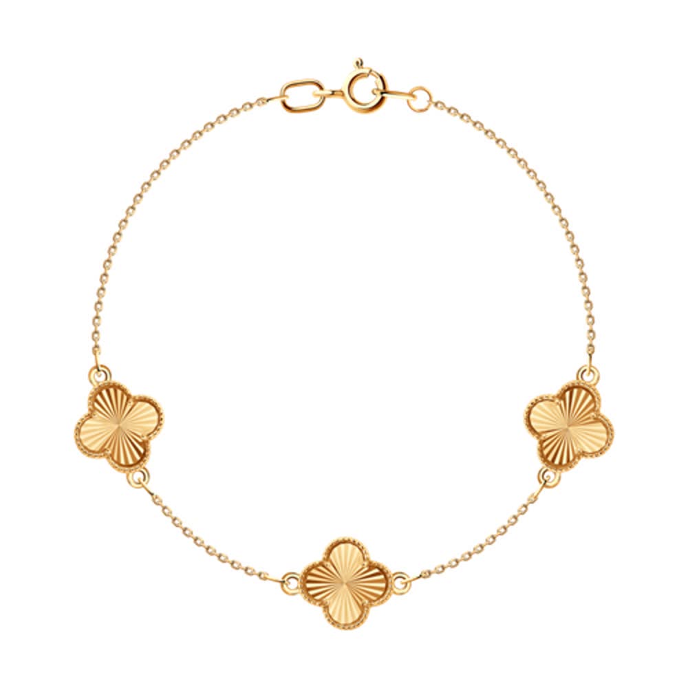This charming and delicate bracelet features three iconic four-leaf clover motifs, all crafted from polished gold. Each clover is adorned with a fine, sunburst-like texture, where etched lines radiate from the center to create a subtle yet captivating play of light. These lucky charms are spaced evenly along a thin, elegant chain, creating a balanced and graceful look on the wrist. The bracelet is secured with a classic spring ring clasp, ensuring a secure fit. This piece is a perfect symbol of luck and good fortune, making it a wonderful gift or a cherished everyday accessory.