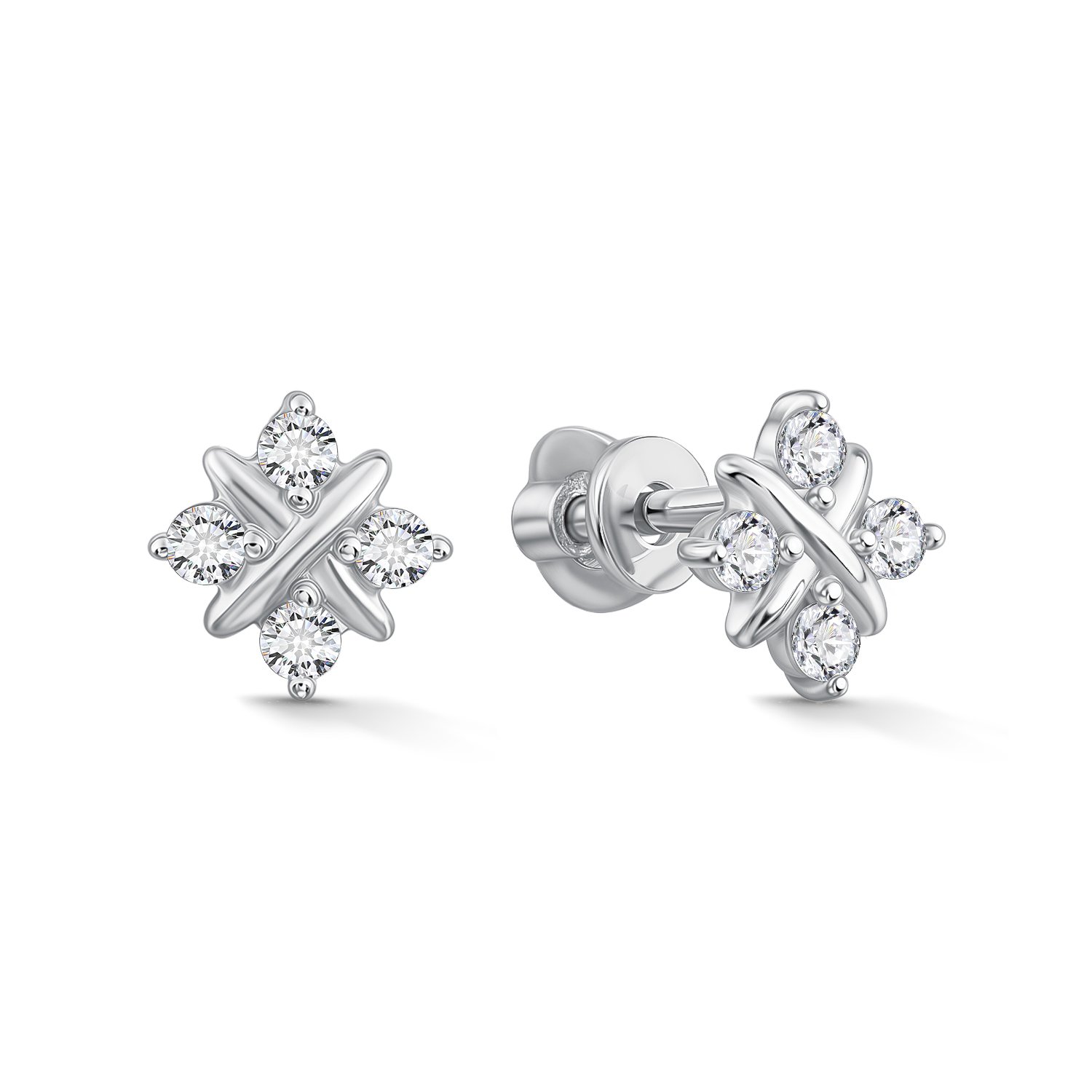 Crafted in polished silver, these refined stud earrings feature four brilliant-cut cubic zirconia stones arranged in a balanced cluster design. A sleek, sculpted cross detail overlays the center, adding dimension and modern elegance.