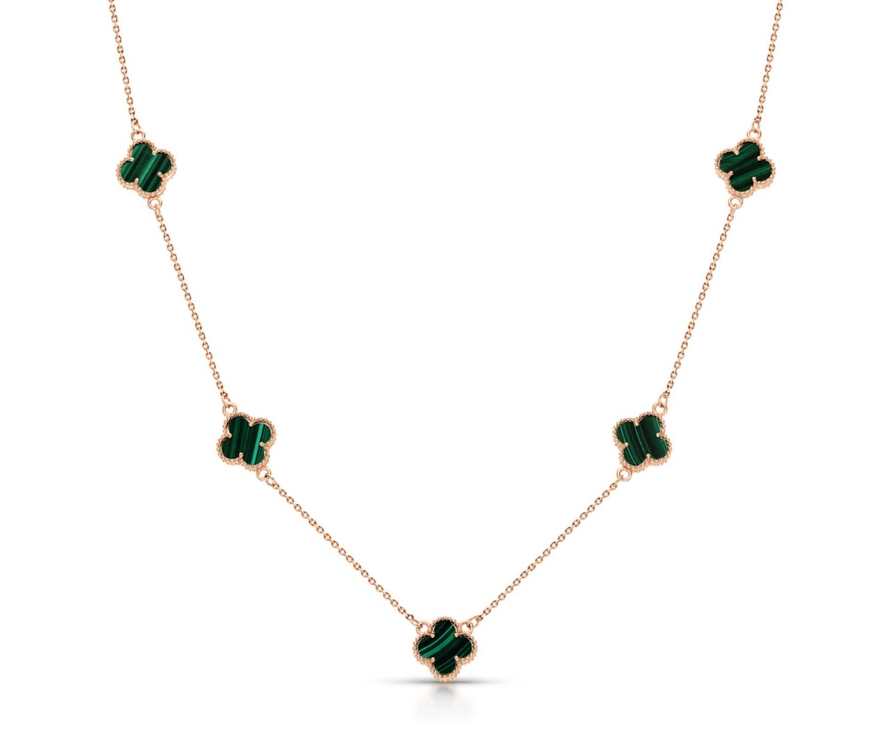 This sophisticated necklace features a series of five four-leaf clover motifs, each set with a vibrant green malachite inlay. The charms are set in a warm, rose gold-toned metal that beautifully complements the natural marbled pattern of the malachite. The clovers are spaced evenly along a delicate chain, creating a graceful station-style necklace. This piece is a perfect blend of classic symbolism and natural beauty, offering a touch of luck and refined elegance to any look.