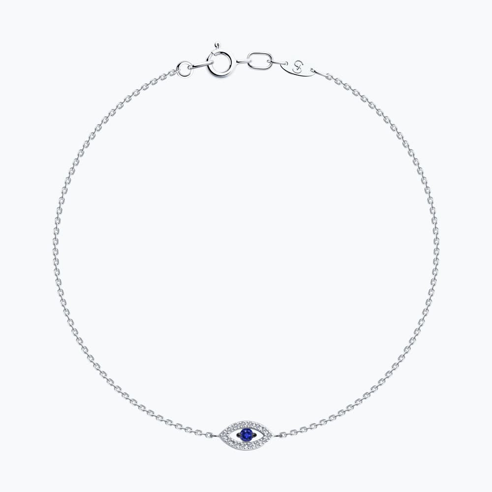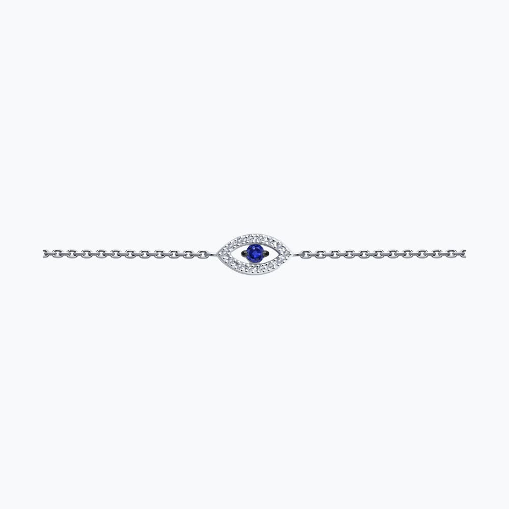This delicate and meaningful bracelet features a captivating eye motif centerpiece, symbolizing protection and good fortune. The design showcases a brilliant blue sapphire center stone encircled by a luminous halo of sparkling diamonds in an elegant marquise eye shape, suspended on a refined white gold chain.