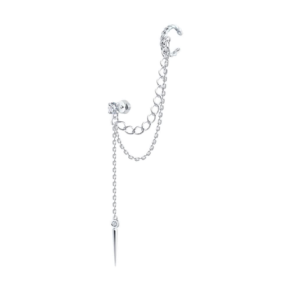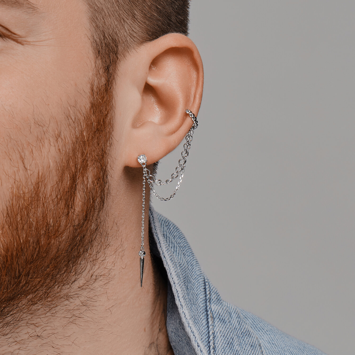 Edgy and stylish, this silver ear cuff features a delicate chain design with a sleek spike drop for a bold statement look.