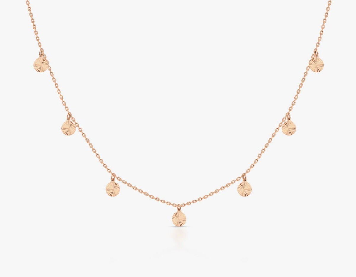 Delicate, radiant, and effortlessly feminine, this gold necklace features a cascade of finely textured charms that shimmer beautifully with every movement. Each piece catches the light like tiny rays of sunshine, creating a soft glow around the neckline.