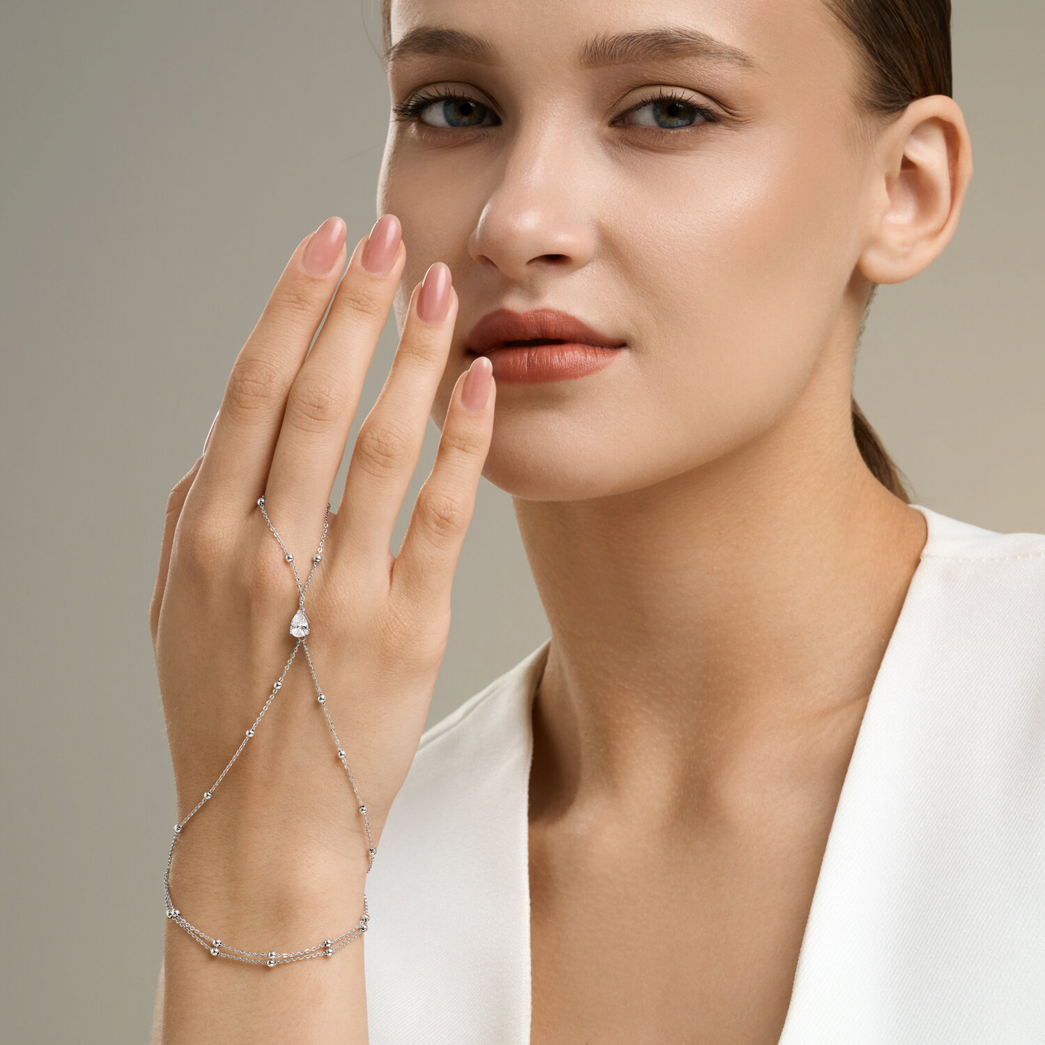 The minimalist design enhances natural beauty without overpowering your style, making it ideal for both everyday wear and special occasions. Whether worn alone or layered with other pieces, this hand chain adds a touch of refined glamour to any outfit.