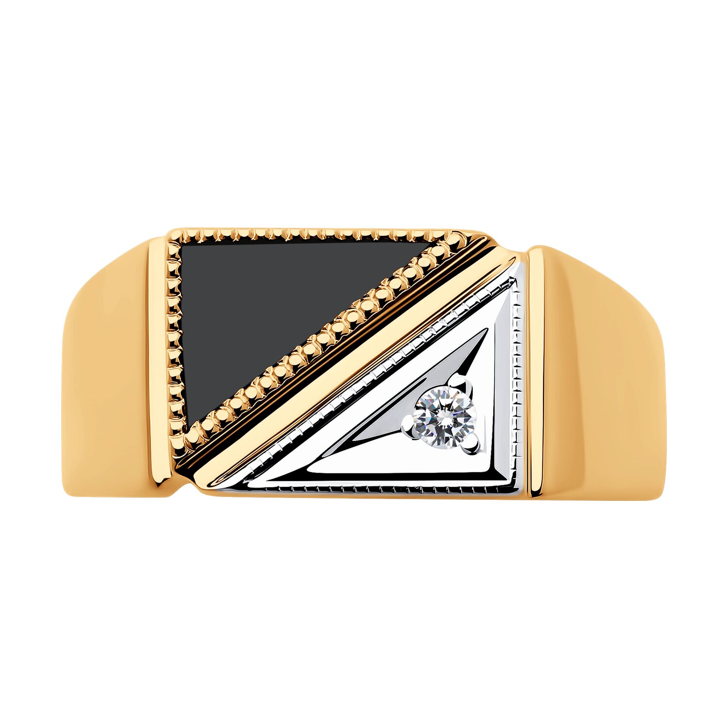 This contemporary men’s signet ring showcases a bold, geometric design with contrasting materials. Its face features two striking triangles—one in polished white gold set with a brilliant-cut diamond, and the other in deep black nanospinel, a durable synthetic gemstone. A fine line of textured gold separates the inlays, accentuating the craftsmanship. The polished yellow gold band adds warmth and elegance, making this ring a modern statement piece with timeless appeal.