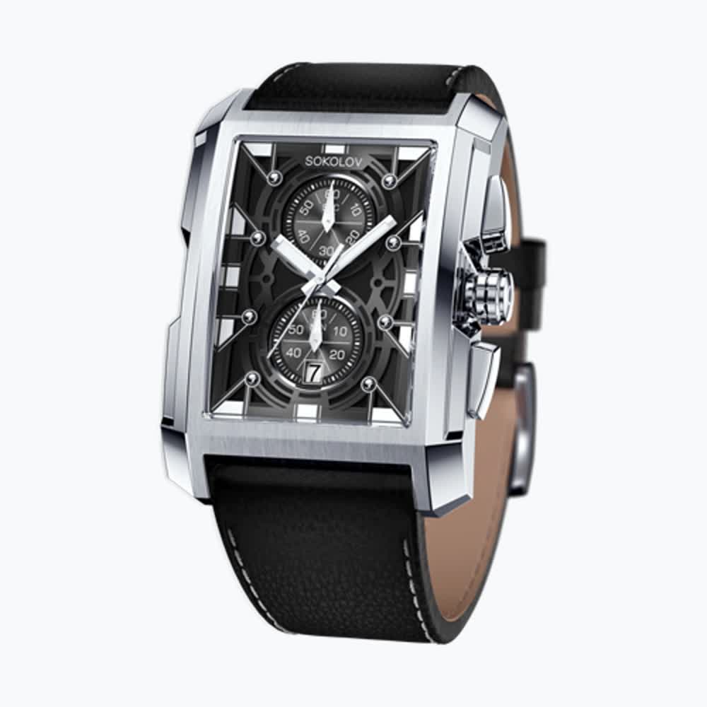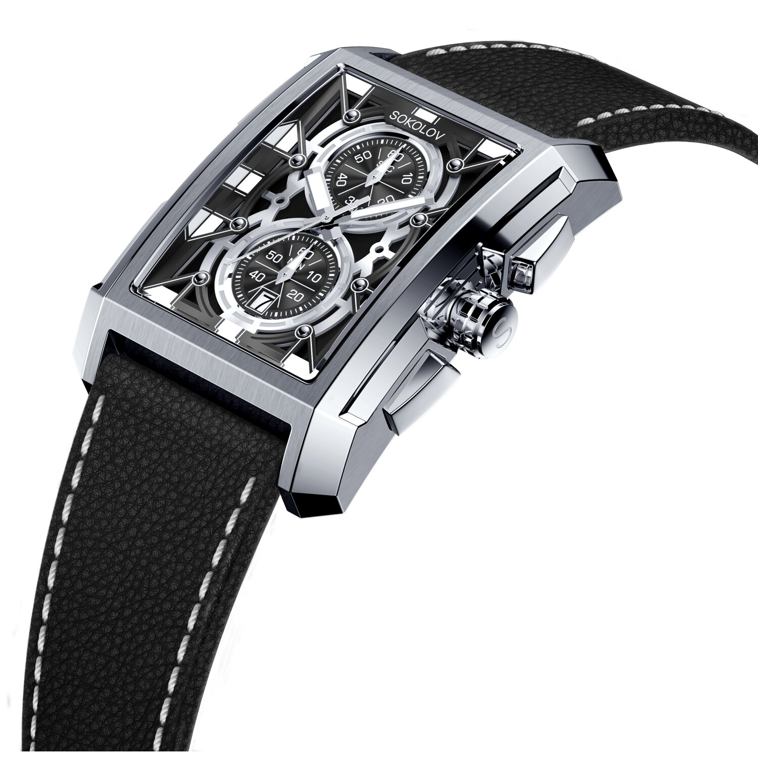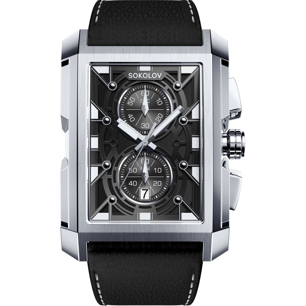 Make a bold statement with the Sokolov “Urbanite” watch. Its striking rectangular design and polished stainless steel case break away from the traditional round timepiece. The dynamic black dial features two sub-dials and a unique, geometric pattern, creating a powerful and modern aesthetic. Paired with a stitched black leather strap, this watch is the perfect fusion of industrial design and sophisticated style.