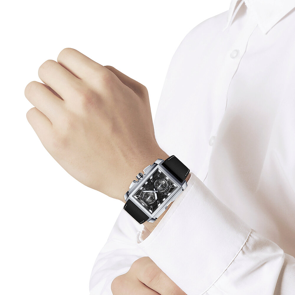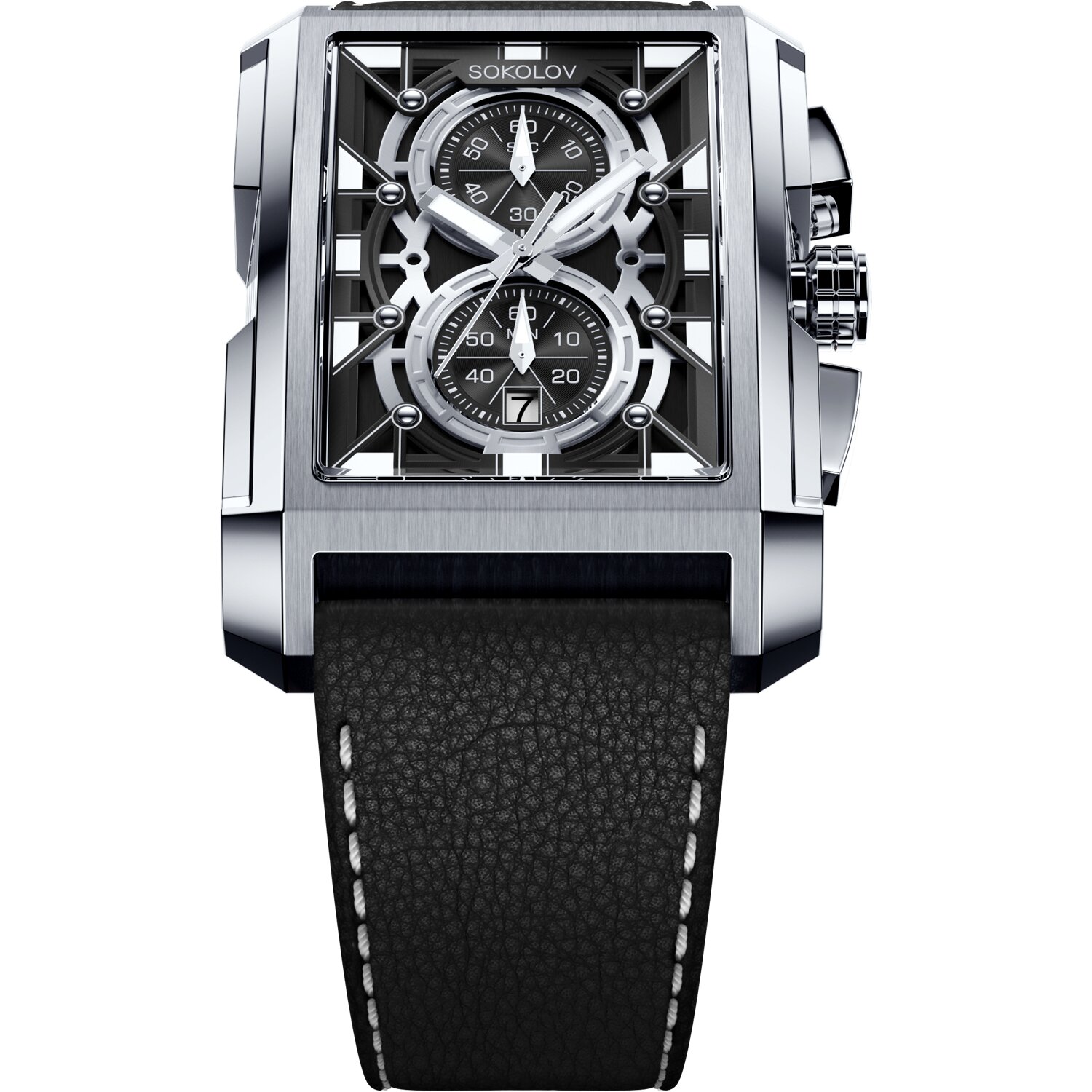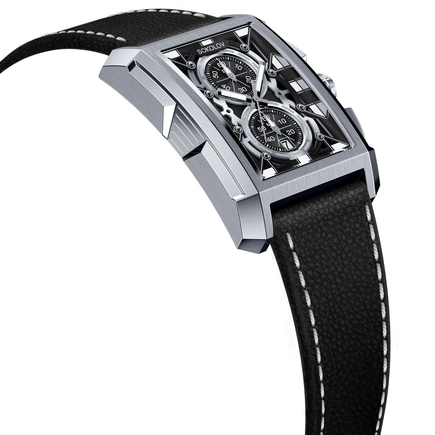 Make a bold statement with the Sokolov “Urbanite” watch. Its striking rectangular design and polished stainless steel case break away from the traditional round timepiece. The dynamic black dial features two sub-dials and a unique, geometric pattern, creating a powerful and modern aesthetic. Paired with a stitched black leather strap, this watch is the perfect fusion of industrial design and sophisticated style.