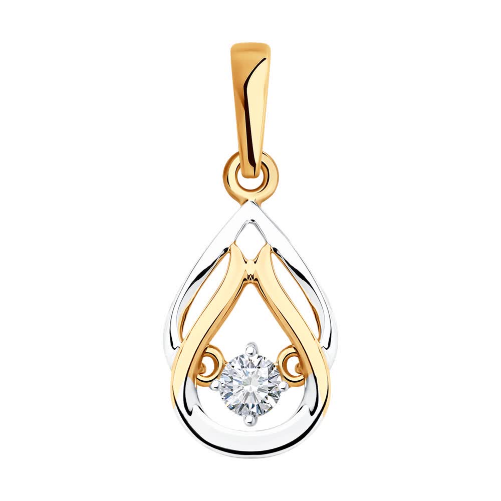 This elegant pendant features a sophisticated two-tone design, crafted with a combination of polished gold and a contrasting white gold or silver-toned metal. The pendant is shaped like a teardrop, with the two metals gracefully intertwined to form an open, fluid frame. At the heart of the pendant is a single, brilliant-cut cubic zirconia, which is securely set to appear suspended within the metal frame. This timeless piece combines classic style with a modern twist, making it a versatile and eye-catching accessory for any occasion.