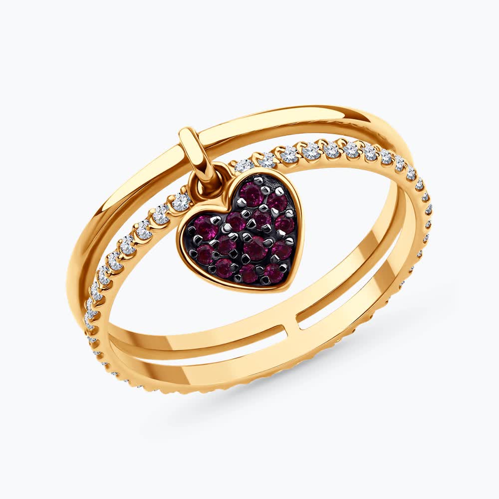 Celebrate love and elegance with this enchanting gold ring, featuring a double-band design adorned with shimmering cubic zirconia. At its center hangs a delicate heart-shaped charm, set with rich red corundum stones that radiate passion and depth. The playful movement of the charm adds a touch of romance and modern flair, making it a perfect gift for someone special—or a timeless treasure for yourself. Stylish, symbolic, and versatile, this ring is designed to capture hearts.