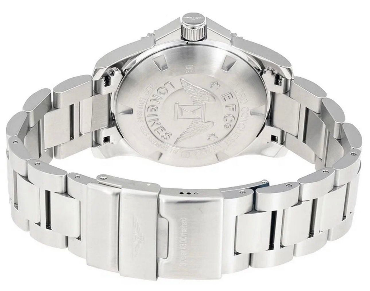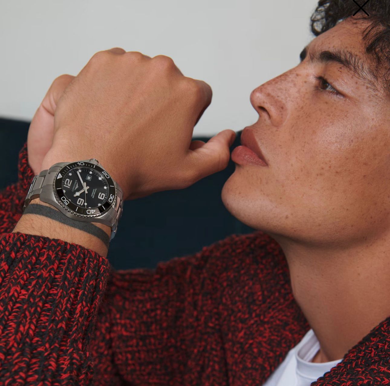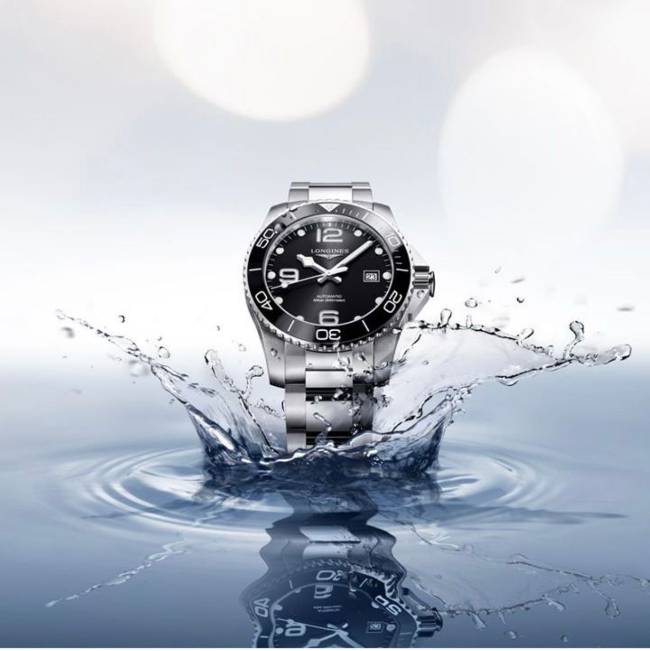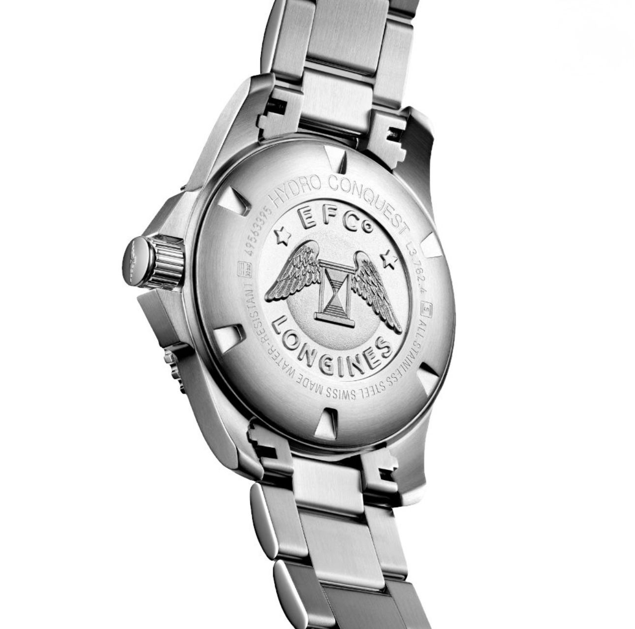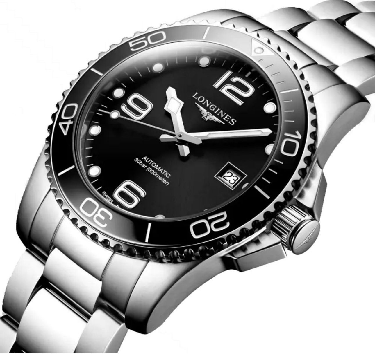 The LONGINES (Longines) L3.782.4.56.6 men’s model from the HydroConquest collection. Automatic movement, caliber L888, beats at a frequency of 25,200 vibrations per hour and has a power reserve of approximately 72 hours. Stainless steel case with a ceramic bezel. Case diameter is 43 mm, thickness is 11.9 mm, weight is approximately 195 grams. Black dial with a sunray pattern. Silvered polished hands. Applied Arabic numerals and hour markers. Numerals and indexes are coated with Swiss Super-LumiNova®. Functions: Hours, minutes, seconds, and date. Scratch-resistant sapphire crystal with a multilayer anti-reflective coating on both sides. The watch, with a unidirectional rotating bezel and screw-down crown and case back, is water-resistant to 30 bar (300 meters), guaranteeing exceptional reliability at all times. Stainless steel bracelet. Double-locking folding clasp.