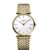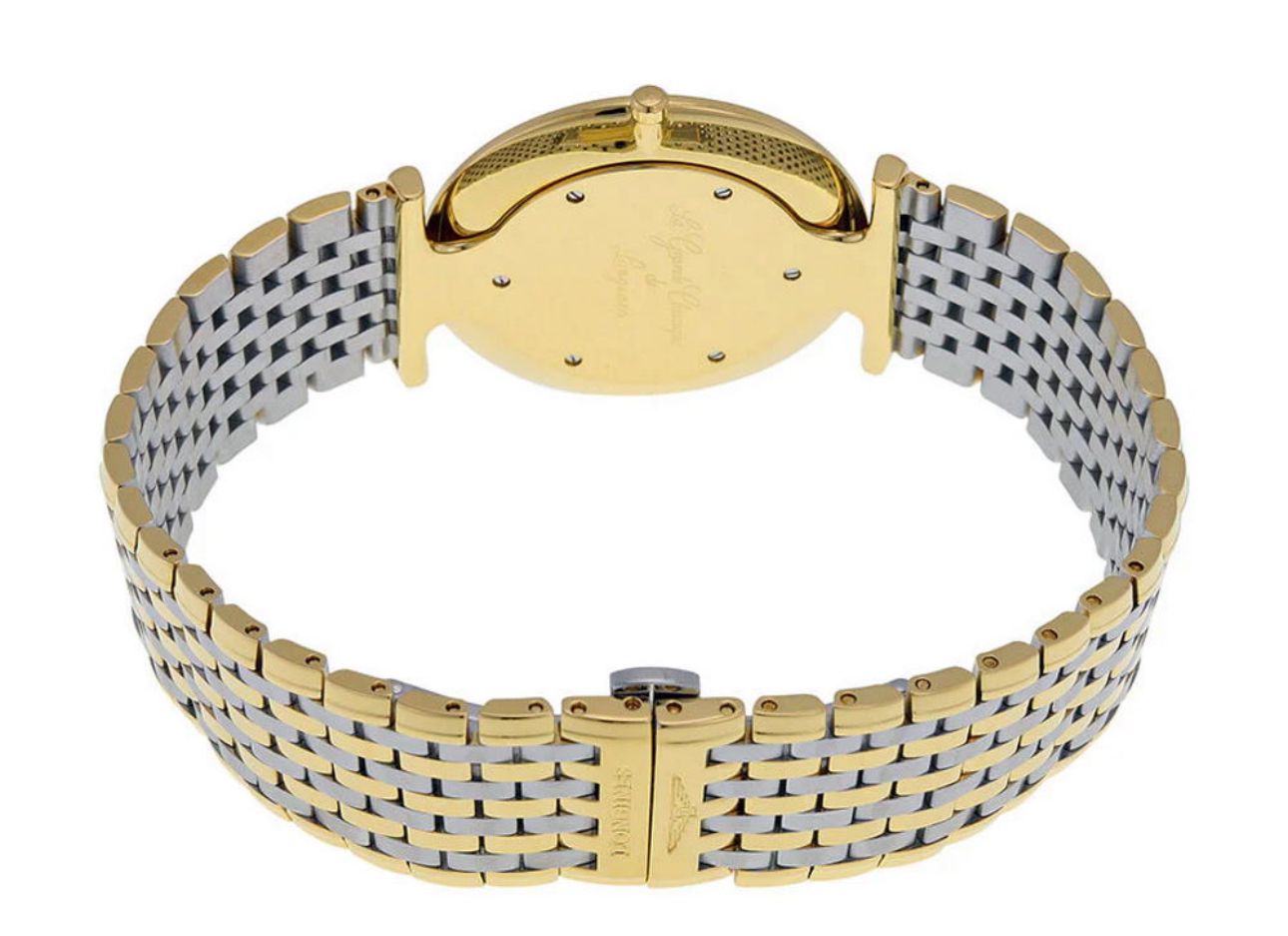 The Longines L4.755.2.11.7  watch from the La Grande Classique de LONGINES collection played a key role in building the brand’s reputation. It features a Swiss quartz movement, caliber L420, powered by a RENATA 346 battery. The watch features a slim profile. The case back is integrated into the steel case with a yellow PVD coating. Diameter 36 mm, thickness 5.2 mm, weight approximately 81 grams. White dial. Black hands. Painted Roman numerals. Functions: Hours, minutes. Scratch-resistant sapphire crystal. Water-resistant to 3 bar (splash-proof). Avoid immersing the watch in water. Stainless steel bracelet with a yellow PVD coating. Triple-fold clasp with a locking system and a pusher. ATTENTION! The stated water resistance is guaranteed only with the crown tightly closed or screwed down!