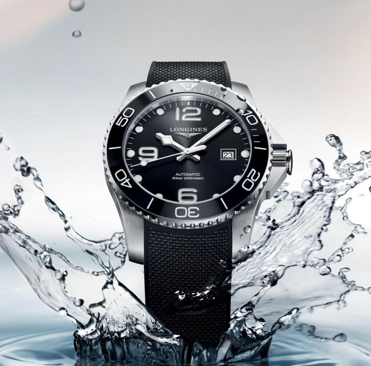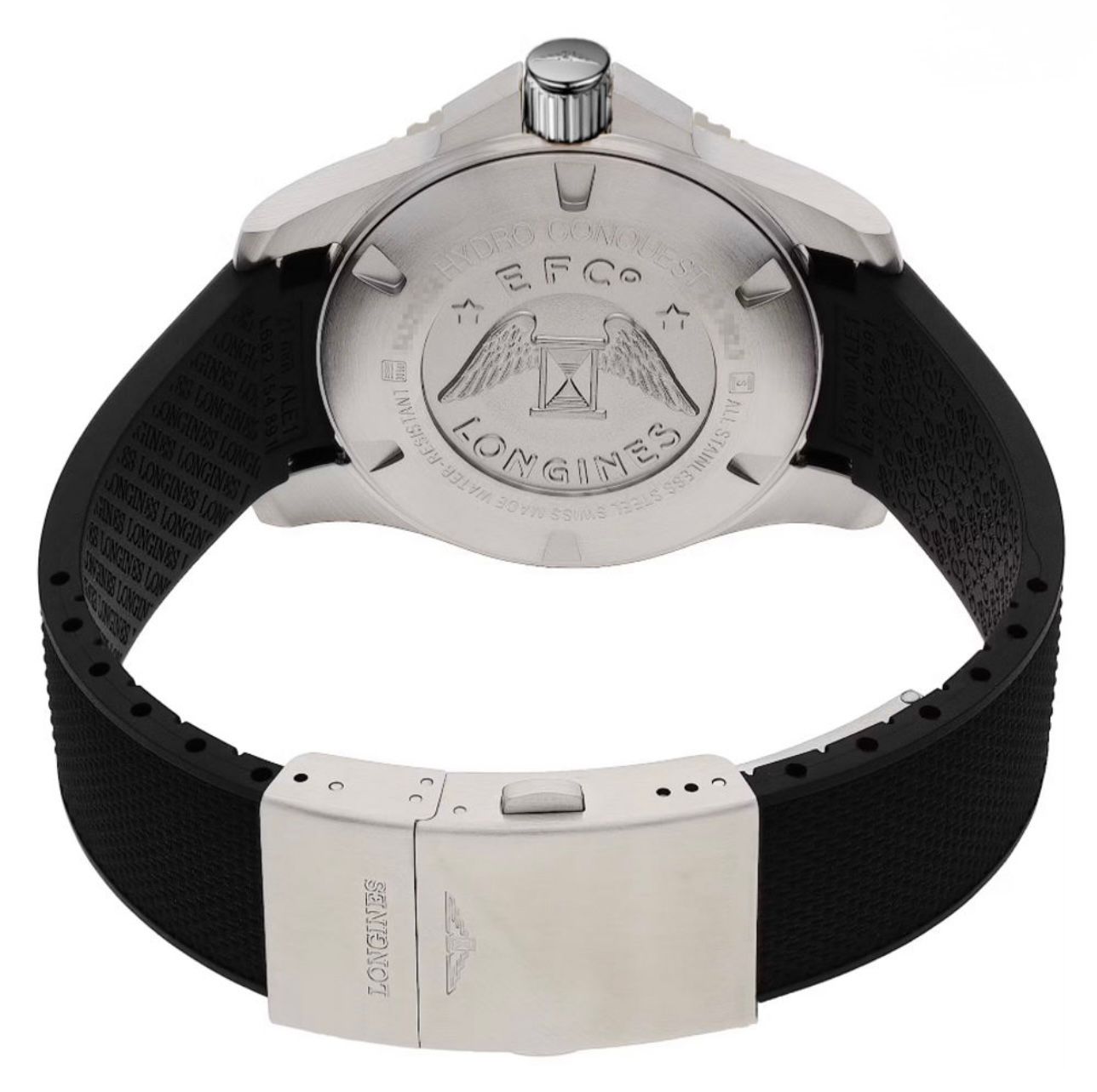 The LONGINES (Longines) L3.782.4.56.9 men’s model from the HydroConquest collection. Automatic movement, caliber L888, beats at a frequency of 25,200 vibrations per hour and has a power reserve of approximately 72 hours. Stainless steel case with a ceramic bezel. Case diameter is 43 mm, thickness is 11.9 mm, weight is approximately 145 grams. Black dial with a sunray pattern. Silvered polished hands. Applied Arabic numerals and hour markers. Numerals and indexes are coated with Swiss Super-LumiNova®. Functions: Hours, minutes, seconds, and date. Scratch-resistant sapphire crystal with multilayer anti-reflective coating on both sides. The watch, with a unidirectional rotating bezel and screw-down crown and case back, is water-resistant to 30 bar (300 meters), guaranteeing exceptional reliability at all times. Black rubber strap. Double clasp with push-button locking system.