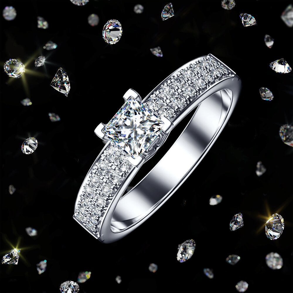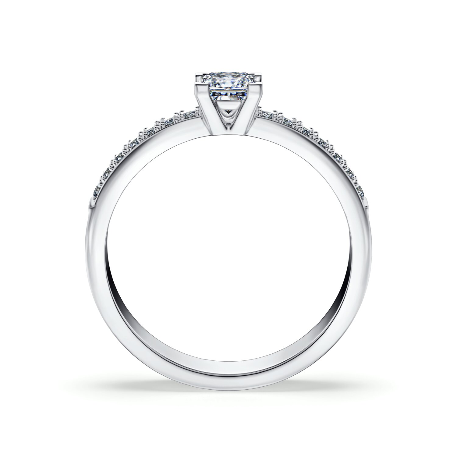 This elegant and brilliant ring is a classic expression of modern luxury. It features a stunning princess-cut diamond as its centerpiece, held securely in a four-prong setting. The ring’s band is crafted from polished white gold and is beautifully accented on both sides with multiple rows of smaller pavé-set diamonds that extend down the shoulders. This design creates a continuous, sparkling surface that enhances the brilliance of the central stone. The ring’s clean lines and radiant sparkle make it a timeless choice for an engagement ring or a significant gift that symbolise love.