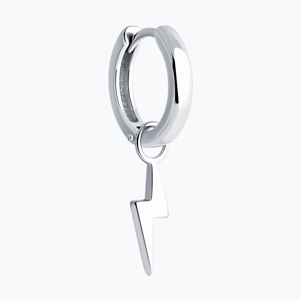 Make a bold statement with this modern and edgy single earring. Crafted from polished sterling silver, this piece features a sleek and sturdy huggie hoop design that sits comfortably on the ear. Dangling from the hoop is a stylized lightning bolt charm, adding a flash of powerful, modern style. This versatile earring is perfect for helix or lobe piercings and is an ideal accessory for those who want to add a unique, rock-and-roll touch to their look.