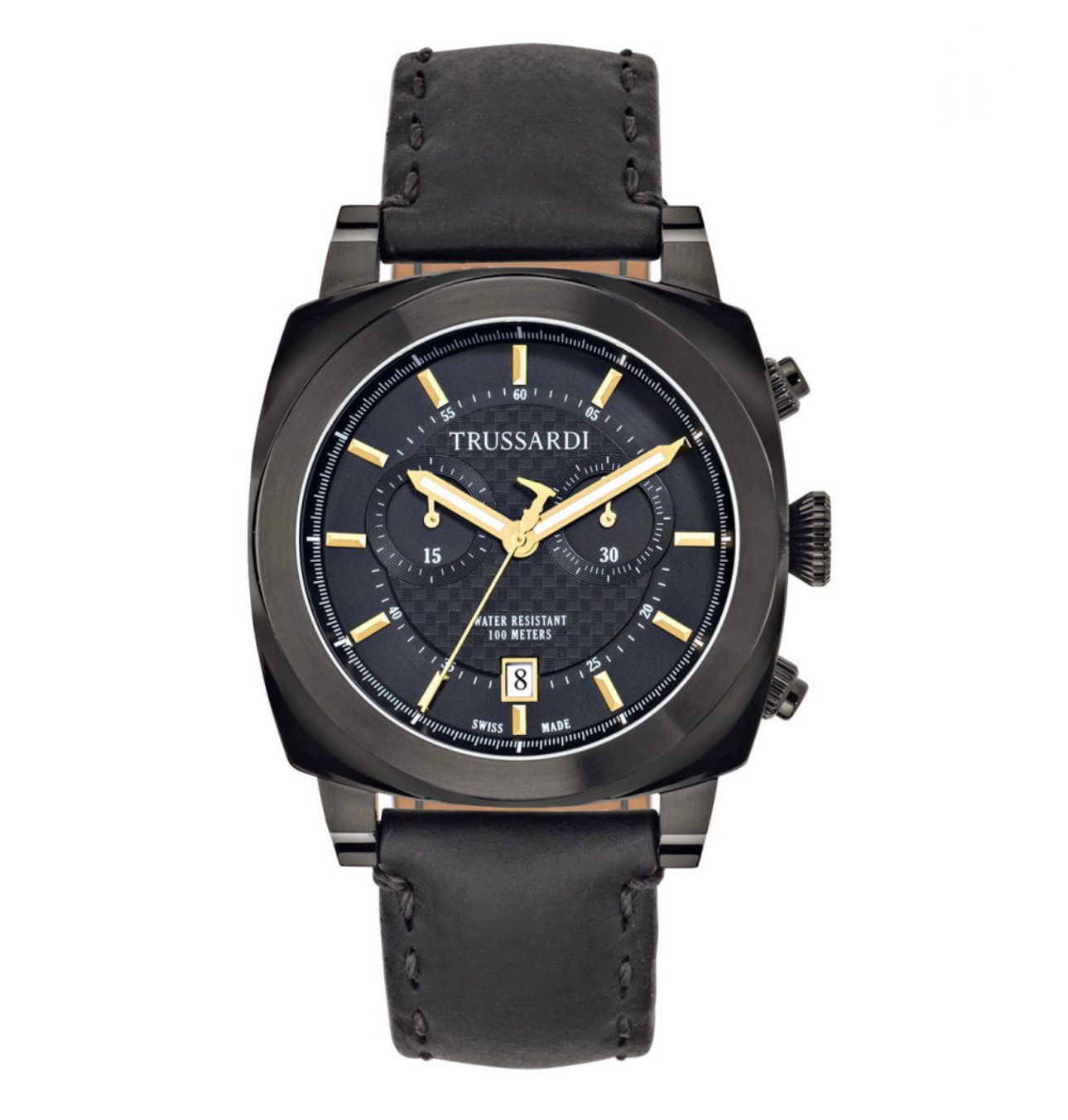 Truly unique and original, the Trussardi R2471602003 model from the 1911 collection. The chronograph function allows you to measure small intervals of time, such as minutes and seconds. It features a date window. The watch is powered by the Swiss RONDA 5021 quartz movement. It also features a date window and luminescent hands. Sapphire crystal will protect your watch from scratches and preserve its aesthetic appearance. The case diameter is 42 mm. Water resistance is 10 ATM, meaning it can withstand splashes, showers, and gentle swimming; however, diving is best avoided. It features a fluted crown. The watch is made of 316L stainless steel with a black PVD coating. It comes with a leather strap and a classic buckle. 2-year warranty. Included with the watch: individual packaging, passport, instructions, and warranty card. An Italian fashion brand with a century-long history and tradition. This watch model is assembled in Switzerland.