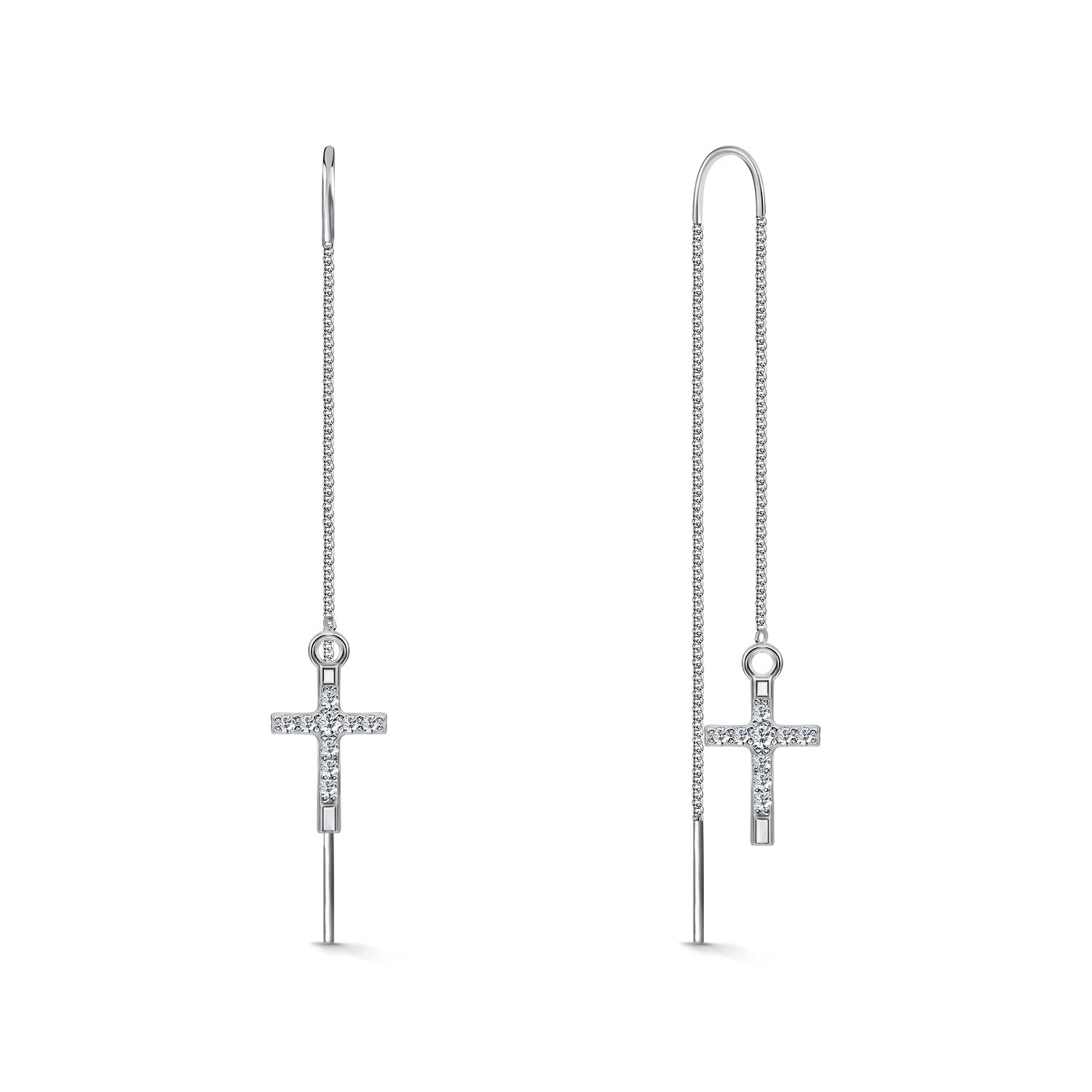 Crafted in polished silver, these elegant threader earrings feature a delicate chain drop accented with a sparkling cubic zirconia cross. The sleek pull-through design creates graceful movement, while the pavé-set stones add refined brilliance.